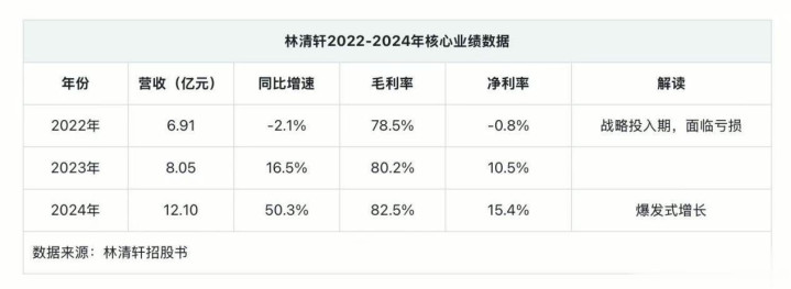 财务数据验证了这套组合拳的有效性。数据显示,2022年至2024年,林清轩营收从6.91亿元稳步攀升至12.10亿元,年复合增长率达32.3%。2023年,公司成功扭亏为盈,并于2024年实现了1.87亿元的净利润。