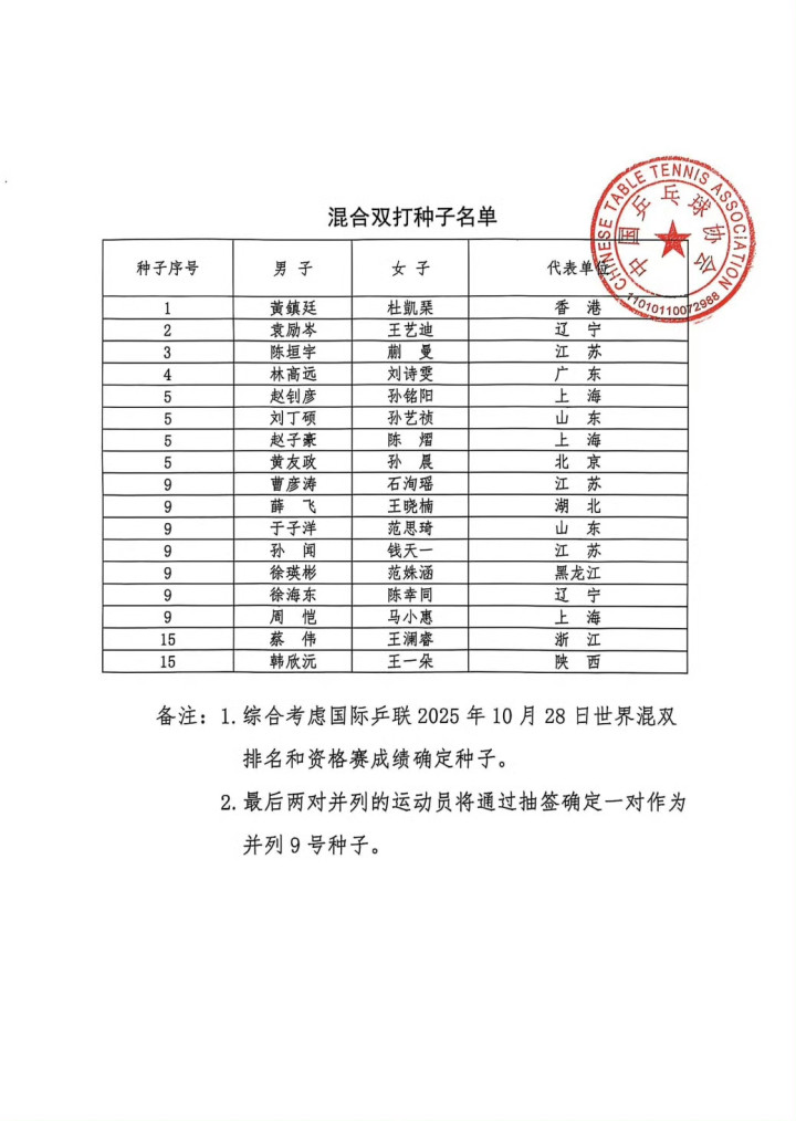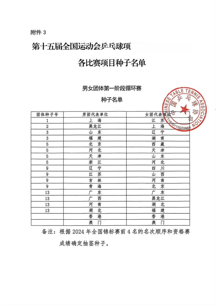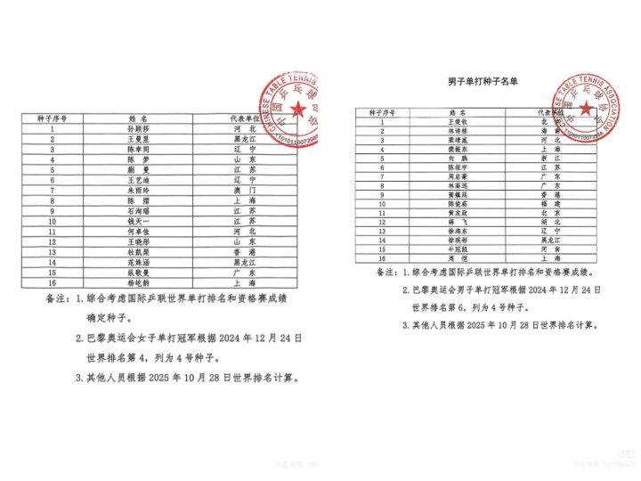北京时间11月1日江苏配资网,全运会乒乓球项目比赛即将开始,中国乒协昨日晚间发布了各项赛事的种子排名。